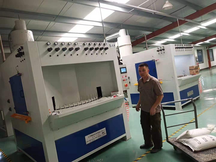 1、  本設(shè)備可采用6-12噴槍設(shè)計,噴槍設(shè)置上下兩組,噴砂上下擺動,噴槍360度可調(diào),保證產(chǎn)品表面均勻噴砂,無死角,成品率100%。