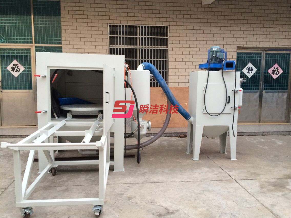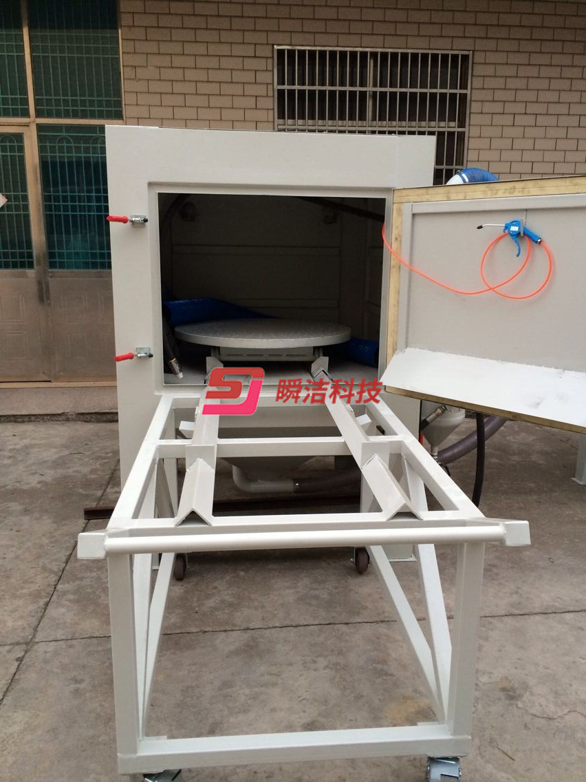 3、配備活動臺車,和轉(zhuǎn)盤,操作時將工件放在轉(zhuǎn)盤上,然后推入機內(nèi)即可噴砂作業(yè),操作簡單省力。