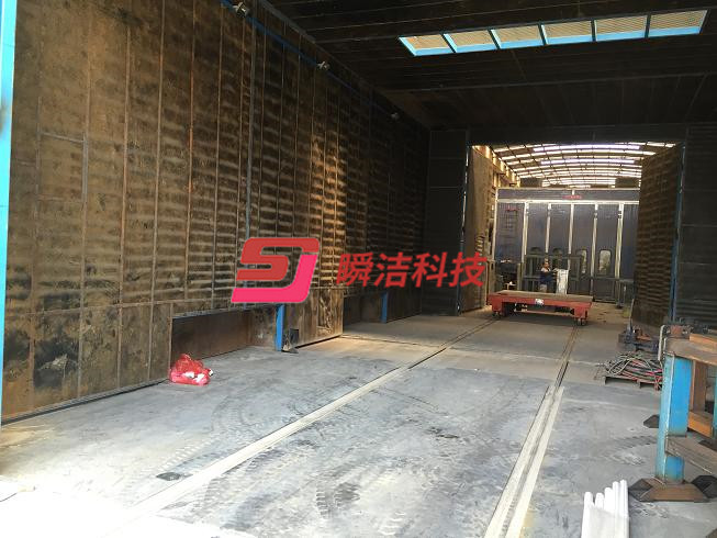 自動機械式回收噴砂(丸)房為平車往復(fù)式專用噴丸機,它由噴丸室體、噴丸器、螺旋輸送機、提升機、分離器、彈丸控制系統(tǒng)、照明系統(tǒng)、除塵系統(tǒng)、輸送平車、電控系統(tǒng)等部分組成。